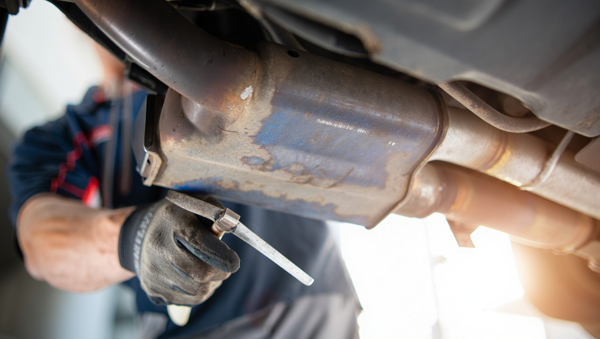 Глушитель холодный — аккуратно постучите по корпусу катализатора ладонью или рукояткой ключа. Здоровый звучит глухо и монолитно. Если слышите дребезжание или рассыпчатый стук — соты внутри разрушены и болтаются.