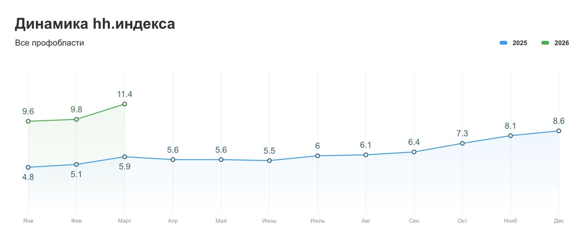 (Анализ hh.индекса) Если февраль 2026 года давал призрачную надежду на стабилизацию и даже позитив, то мартовская статистика от hh.ru принесла только разочарование. Рынок труда РФ не просто стагнирует — он сжимается, как пружина, выдавливая соискателей в зону экстремальной конкуренции. Мы в проекте bezpaniki разобрали свежие графики. Если вы ищете работу в IT, Маркетинге или Менеджменте — этот текст обязателен к прочтению. Без иллюзий. «Рынок нанимателя» перешел в фазу «Рынок силы» Главный маркер катастрофы — hh.индекс. Это соотношение активных резюме к открытым вакансиям. Проще говоря: сколько человек претендует на одно место. Посмотрите на график «Динамика hh.индекса (Все профобласти)» В марте 2025 года он был комфортным — 5.9. Бизнес и соискатели были в балансе. В марте 2026 года индекс пробил отметку 11.4. Конкуренция за год выросла в 2 раза. На каждое рабочее место теперь претендует 11 человек. Это больше не рынок соискателя. Это рынок, где наниматель диктует условия, а вы — оди