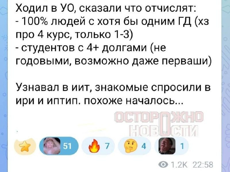 Раньше отчисление наступало только при наличии пяти и более «хвостов». Студенты говорят, что правила ужесточили на фоне привлечения учащихся к работе в сфере БПЛА-систем. Начинаем готовиться к сессии уже сейчас 🥳 CtrlAltDelights- подписаться