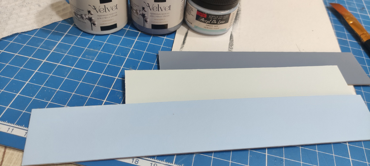 В процессе доработок под петли я обдумывал варианты дизайна . Пришёл к выводу , что, раз полоски в одном направлении не симметрично будут смотреться, то остаётся сделать несколько цветовых прямоугольных рамок из присутствующих оттенков. Это немного свяжет нижний дизайн с дизайном крышки. Не художник я , тонкие полоски рисовать кистью не умею, потому воспользовался продолжением своей технологии . А именно - сделал рамку из картона и покрасил. И ровно , и аккуратно . Всего то - канцелярский нож и линейка. Кстати, вместо карандаша, для строгой точности, ставлю метки канцелярским ножом. И точно , и стирать потом не нужно, так как часто светлые тона проявляют карандашные метки.