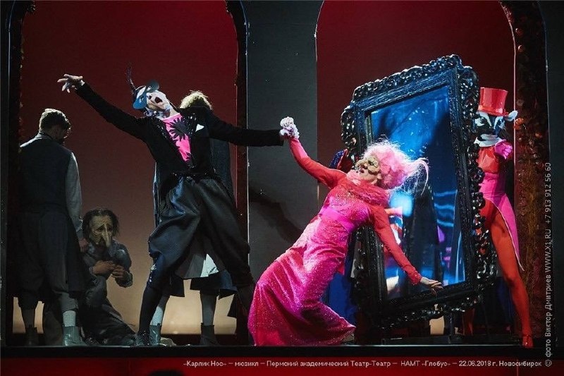 «Карлик Нос», Пермский Театр-Театр, режиссёр Борис Мильграм, художник-сценограф Даниил Ахмедов, художник по костюмам Ирэна Белоусова. Мюзикл на музыку Лоры Квинт поставлен по оригинальной пьесе Бориса Мильграма и Ильи Губина, созданной по мотивам сказки Вильгельма Гауфа о Карлике Носе. Спектакль Бориса Мильграма полон множества ярких эффектов, цирковых номеров и славится участием живой гусыни. Но помимо такого нестандартного пернатого артиста, в спектакле появляются и другие «фантастические твари», но сыгранные уже актёрами-людьми. Например, ансамбль животных. В сказке Вильгельма Гауфа старухе-колдунье прислуживают антропоморфные белки и морские свинки. В спектакле Бориса Мильграма эти роли исполняют артисты в шикарных, но не аляповатых, а очень элегантных костюмах и цилиндрах, с кукольным головами, которые и напоминают милых грызунов. Их задача — создать таинственную, но динамичную атмосферу, условно изображать подданных замка, являясь живым подтверждением могущества колдуньи Кретер