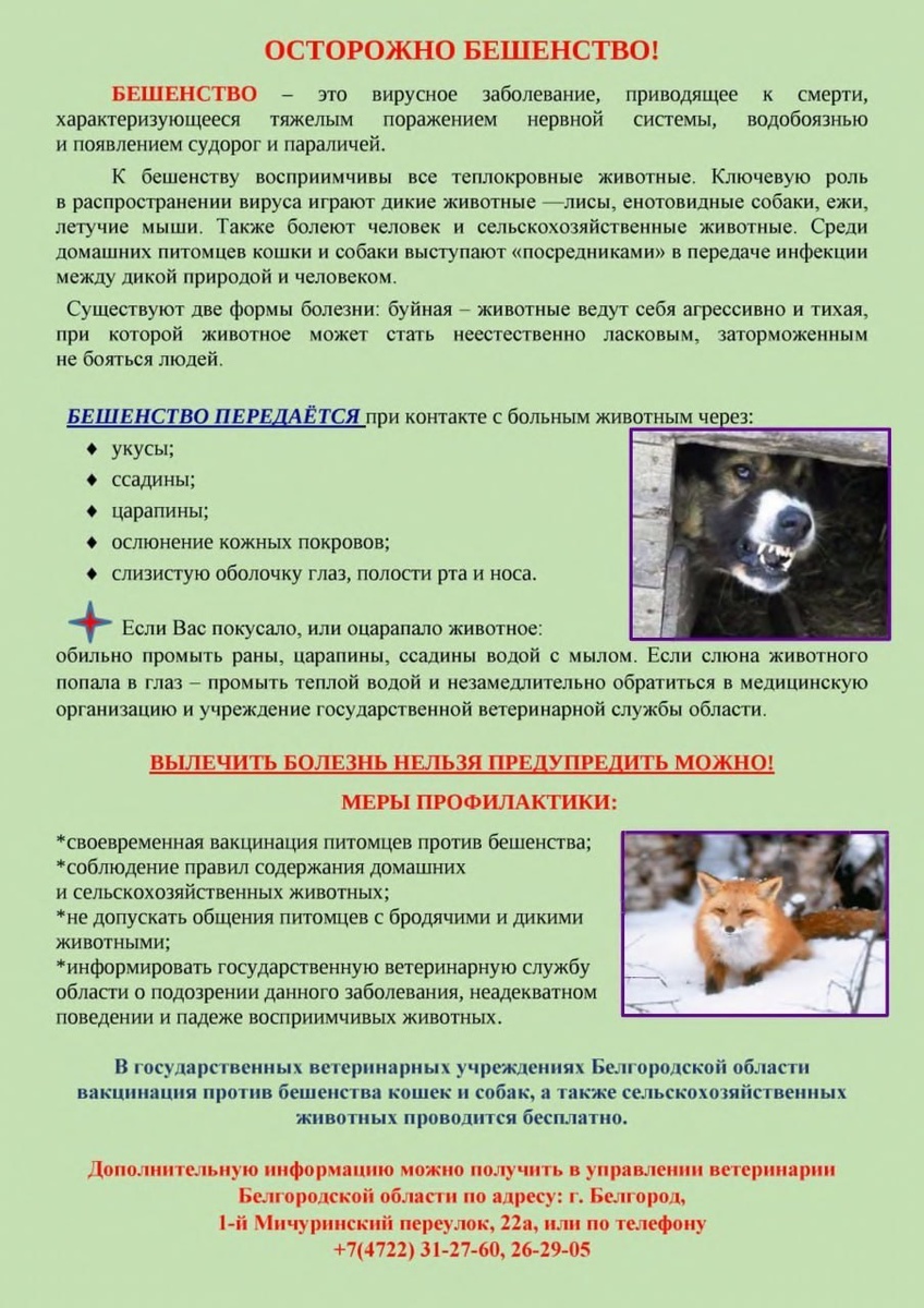 Оно неизлечимо и в 100% случаев приводит к смерти, если вовремя не принять меры. Но его можно предотвратить! В нашей области ежегодно регистрируются случаи болезни среди диких (лисы, волки, енотовидные собаки) и домашних животных. Источником может стать даже внешне здоровый питомец, так как вирус появляется в слюне за 1-7 дней до первых симптомов. Как защитить себя и своих близких? ✅ Главное правило: ежегодная вакцинация питомцев. В Белгородской области привить животное от бешенства можно БЕСПЛАТНО. ✅ Правила содержания: Регистрируйте животное в ветстанции в течение 3 дней. Выгуливайте собак только на поводке и в наморднике. Не контактируйте с дикими животными (ежи, лисы, грызуны) и не подбирайте бездомных зверей. ⚠️ Что делать при укусе или царапине? Немедленно промойте рану водой с мылом (10-15 минут). Наложите стерильную повязку. Срочно обратитесь в ближайший медпункт или поликлинику. Вызовите ветеринарную службу для изоляции животного (