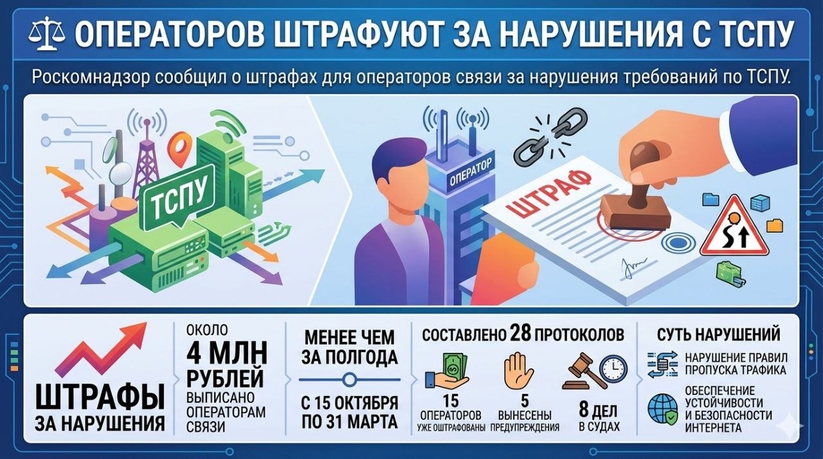 Роскомнадзор сообщил, что менее чем за полгода операторы связи получили штрафы на сумму около 4 млн рублей за нарушения требований по использованию известных технических средств противодействия угрозам (ТСПУ). С 15/10 по 31/03 было составлено 28 протоколов: 15 операторов связи уже оштрафованы, пятерым пока вынесли предупреждения, ещё восемь дел находятся на рассмотрении в судах. Нарушения связаны с правилами пропуска трафика через инфраструктуру, обеспечивающую устойчивость и безопасность интернета. 🤩 PRO: история продолжается