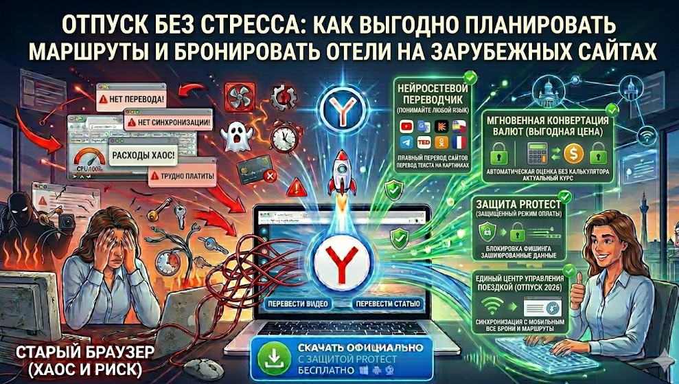 Планирование самостоятельного путешествия должно приносить радость, но на деле часто превращается в головную боль. Вы открываете десятки зарубежных сайтов авиакомпаний, агрегаторов жилья и локальных турфирм. Приходится продираться сквозь непонятные термины на английском, испанском или турецком, судорожно умножать в уме местную валюту на актуальный курс и бояться, что вы случайно забронировали номер без окон или купили билет без багажа. А когда дело доходит до оплаты на незнакомом сайте местной авиалинии, становится откровенно страшно за данные своей банковской карты. Чтобы подготовка к отпуску была комфортной, а покупки — безопасными, ваш браузер должен быть настоящим полиглотом и телохранителем. Мы рекомендуем бесплатно скачать Яндекс Браузер по официальной ссылке. Рассказываем, как он сэкономит вам время, нервы и деньги в любой точке мира. Главная беда обычных встроенных переводчиков — они «ломают» верстку сложных сайтов. Кнопки съезжают, а выпадающие списки перестают работать, из-за