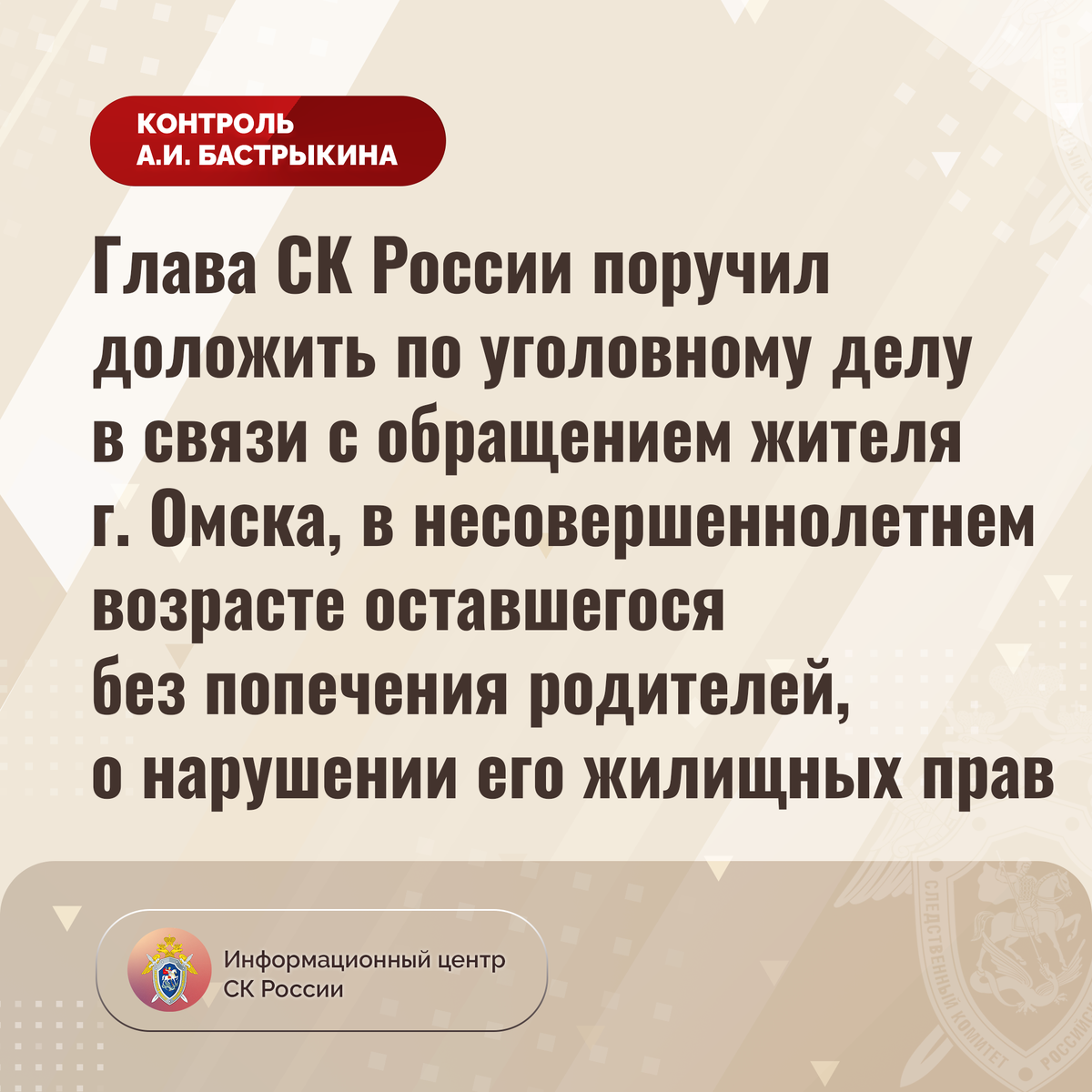 Глава СК России поручил доложить по уголовному делу в связи с обращением жителя г. Омска, в несовершеннолетнем возрасте оставшегося без попечения родителей, о нарушении его жилищных прав К Председателю СК России А.И. Бастрыкину через Информационный центр обратился житель города Омска, в несовершеннолетнем возрасте оставшийся без попечения родителей, по вопросу длительного непредоставления ему положенного по закону жилья. С 2015 года молодой человек состоит на учете лиц, нуждающихся в обеспечении жилыми помещениями, однако до настоящего времени его права не реализованы. Обращения в компетентные органы результатов не принесли. В СУ СК России по Омской области возбуждено уголовное дело. Председатель Следственного комитета Российской Федерации Александр Иванович Бастрыкин поручил руководителю СУ СК России по Омской области Виталию Владимировичу Батищеву доложить о ходе и результатах расследования уголовного дела. Исполнение поручения поставлено на контроль в центральном аппарате ведомства