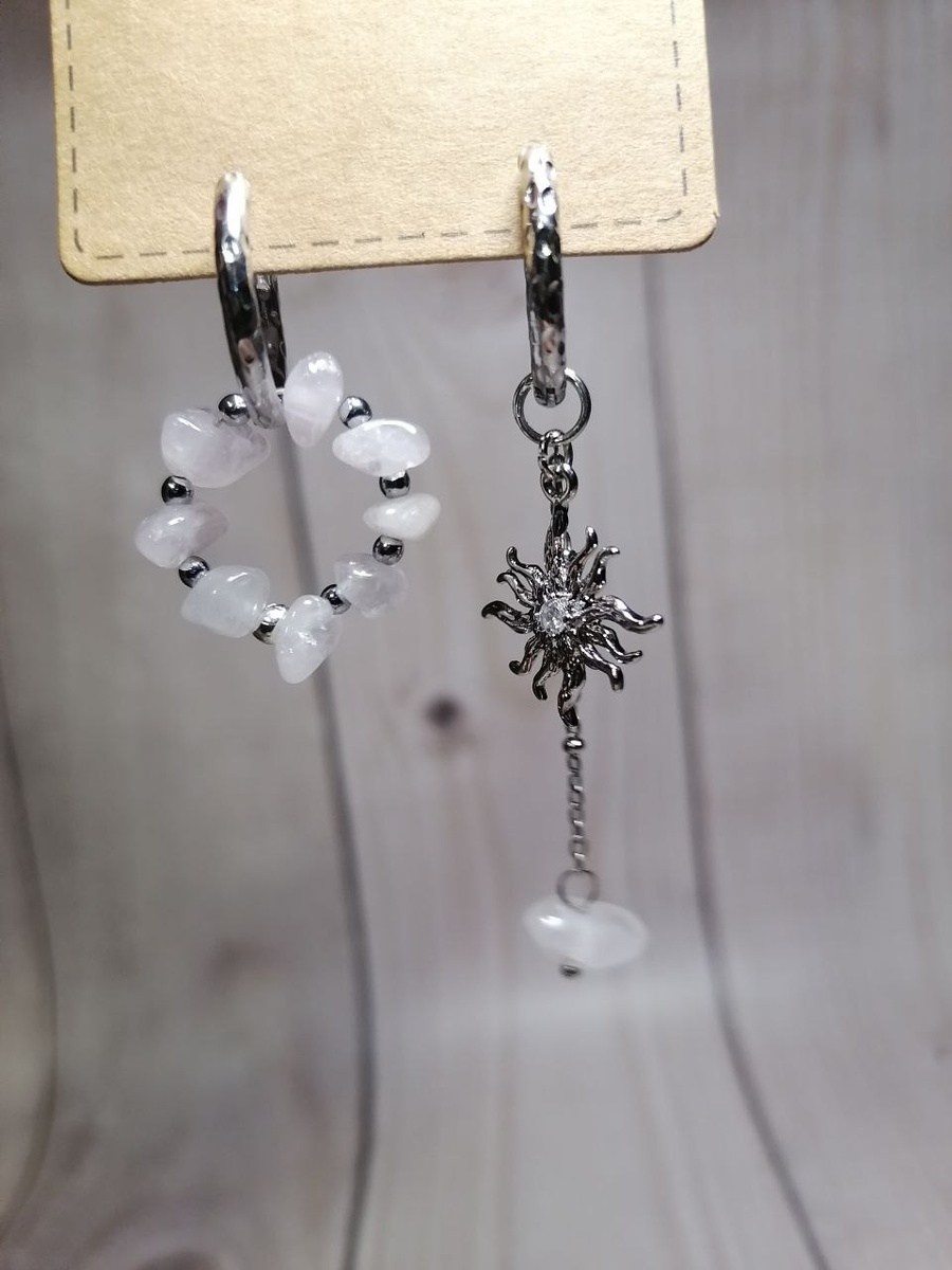 Откройте для себя магию асимметрии с этими изысканными серьгами! Сочетание лаконичности и утончённости создаёт неповторимый образ, который не оставит равнодушным. Особенности дизайна: Левая серьга: выполнена в виде элегантного кольца, украшенного гладкими бусинами из розового кварца. Нежные переливы камня создают ощущение лёгкости и воздушности, а чередование с небольшими металлическими элементами добавляет изысканности. Правая серьга: привлекает внимание эффектной подвеской в виде сияющего солнца, выполненного из полированного металла. От солнца на изящной цепочке свисает крупная бусина из розового кварца, завершая композицию. Асимметрия: делает украшение по-настоящему уникальным — каждая серьга индивидуальна, но вместе они создают гармоничный дуэт. Материалы: сочетание качественного металла и натурального розового кварца придаёт изделию благородство и утончённость. Почему эти серьги стоит выбрать? Трендовый дизайн: асимметричные серьги — must have этого сезона. Универсальность: подой