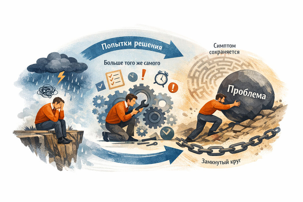 Иногда проблема держится не только на самой трудности, но и на том, как именно человек пытается с ней справиться. Звучит парадоксально, но в жизни это встречается постоянно: то, что должно было помочь, незаметно начинает поддерживать симптом.