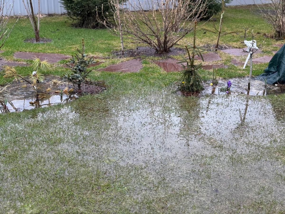 Финская ель утопает в очередной раз, опять пришлось рыть ручеек, чтоб хоть как-то помочь воде уйти. Бедные растения, как они справятся и справятся ли вообще пока не понятно. У нас обещают еще три дня дождей, потом мороз. Надеюсь хотя бы в мае погода наладится и заморозков не будет.