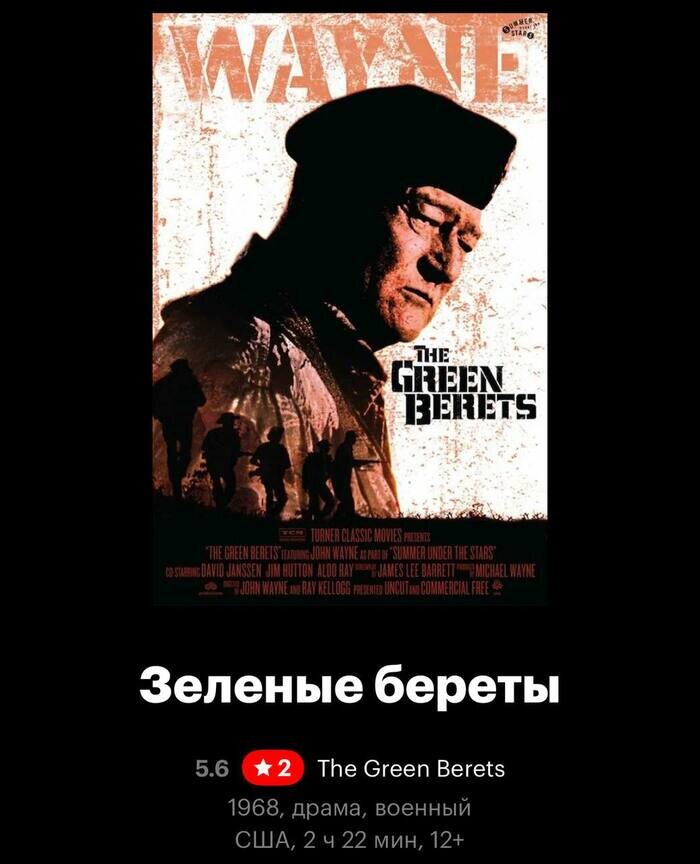 Меня всегда интересовал контекст этой культовой фразы сказанная рядовым "Шутником" в культовом фильме "Цельнометаллическая оболочка". Я знал, что есть такой актёр Джон Уэйн, знал, что он много играл ковбоев, отсюда и думал, что Шутник говорит про сержанта Хартмана, что он типо крутой ковбой, но оказалось, что всё куда прикольнее. Есть фильм "Зелёные береты", книгу по которой написан сценарий купил Джон Уэйн, он же снял фильм и снялся в главной роли. Джони был расстроен антивоенным настроением, ишь ты, амеликанцам не хотелось лететь к чёрту на рога, бегать по джунглям и убивать коммунистов, надо было снять фильм и показать как там наши бравые ребята воюют за свободу! Джони и заснял, получилось тупо в лоб. Считается, что это художественный фильм, но выглядит это как пропаганда или даже обучающий фильм для школьников или бойцов вновь прибывших в расположение. Тут клише на клише, всё театрально вычурно, топорно, но очень понятно кто хороший, а кого надо убивать. Зачем, почему, история кон