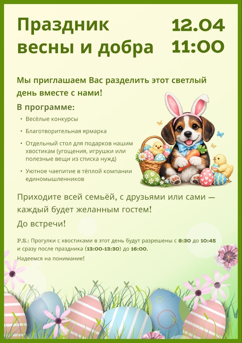 ! 🌸 Напоминаем вам, что уже в это Пасхальное воскресенье, 12 апреля в 11:00, в приюте состоится наш праздник весны и добра✨ Вас ждут: 🎪 Благотворительная ярмарка, где можно приобрести уникальные товары, сделанные руками наших волонтёров. 🙏МЫ БУДЕМ РАДЫ, ЕСЛИ ВЫ ЗАХОТИТЕ ПОУЧАСТВОВАТЬ И ПРИНЕСЕТЕ СВОИ РУЧНЫЕ ВЕЩИ ДЛЯ ПРОДАЖИ — это поможет собрать больше средств для наших хвостиков! 🍰 Сладкий конкурс! В конце праздника мы выберем самый красивый и вкусный самодельный пасхальный кулич или пирог! Приезжайте и хвастайтесь своей выпечкой — пусть победит самый творческий и аппетитный десерт. ☕ Уютное чаепитие в кругу друзей! Не забудьте захватить на стол что-нибудь вкусненькое для общего праздничного чаепития. Этот день мы создаём вместе — чтобы поддержать наших подопечных, пообщаться в теплой атмосфере и подарить друг друг у весеннее настроение. Ждём вас 12 апреля в 11:00!
