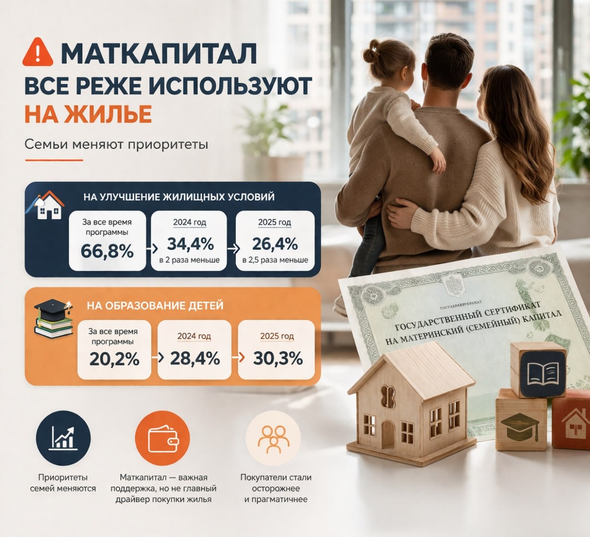 ⚠️ Интересная тенденция по маткапиталу: все меньше семей направляют его именно на улучшение жилищных условий. На первый взгляд это выглядит неожиданно. Потому что много лет маткапитал у большинства ассоциировался в первую очередь с квартирой, ипотекой, первоначальным взносом или погашением кредита. Но цифры показывают: приоритеты постепенно меняются. С 2007 года в России выдано 15,1 млн сертификатов. И за все время действия программы 66,8% средств были использованы именно на улучшение жилищных условий. Но если смотреть на последние годы, доля такого использования заметно снижается: ▪️ в 2024 году — 34,4% от всех обращений; ▪️ в 2025 году — уже 26,4%. То есть сейчас это уже в 2–2,5 раза ниже, чем средний показатель за весь период программы. Что это значит на практике? Это значит, что все больше семей уже не воспринимают маткапитал только как инструмент для решения квартирного вопроса. И параллельно растет другое направление — образование детей. Если за весь срок действия прогр