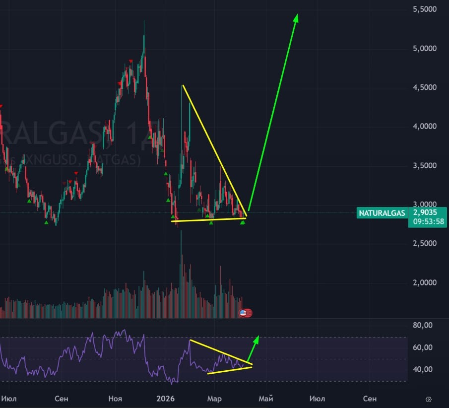 ⛽️ ГАЗ 🟢В прошлом посте я показывал газ на недельном тайм-фрейме, где видны сигналы на покупку. На текущий момент пружина уже прилично сжимается, и скорее всего выход из треугольника на графике и на RSI состоится на этой неделе. Учитывая, что газ показывал высокую волатильность в январе и в феврале, летая на 100% вверх и вниз, то скоро увидим новую степень болевых ощущений среди газовых трейдеров. Готовимся. 🚗 Выйти, конечно же можем куда угодно из этой истории, но мне кажется, что при любом исходе с Трампом газ смотрит вверх. Жду газ среднесрочно вверх. #газ #ng1 #американскийгаз #фьючерсгаза #naturalgas #bogdanoffinvest $NGJ6 $NRJ6 $NGK6 $NRK6 $NGM6 $NRM6