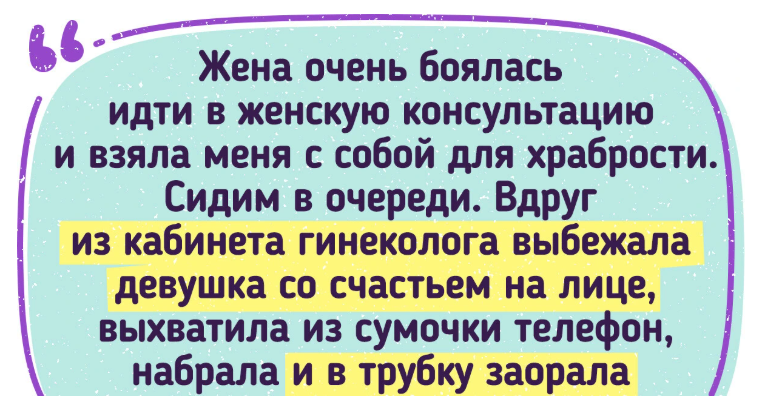 - Жена очень боялась идти в женскую консультацию и взяла меня с собой для храбрости. Сидим в очереди. Вдруг из кабинета гинеколога выбежала девушка со счастьем на лице, выхватила из сумочки телефон, набрала и в трубку заорала: «Антон, это не беременность, а ожирение!» © aleks177
