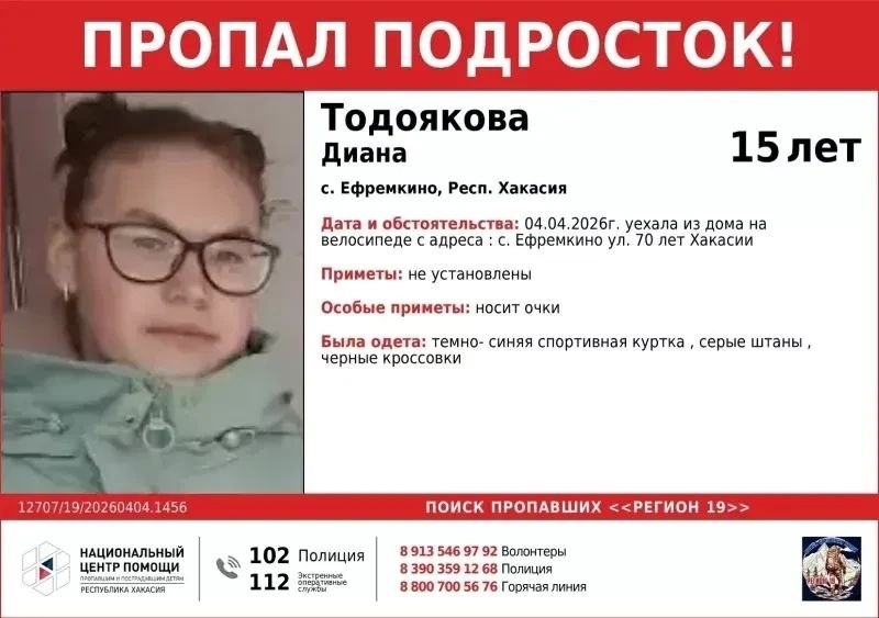 В Хакасии с 4 апреля разыскивают 15-летнюю Диану Тодоякову. В тот день девочка-подросток укатила из дома на улице 70 лет Хакасии в селе Ефремкино Ширинского района, и с тех пор о ее местонахождении ничего неизвестно. Предположительно, она может находиться на территории Красноярского края. Из особых примет — девочка носит очки. БЫЛА ОДЕТА: серые штаны, темно-синяя спортивная куртка, черные кроссовки. «Уже третьи сутки мы ищем 15-летнюю жительницу села Ефремкино Ширинского района, которая пропала при загадочных обстоятельствах. Она уехала из дома на велосипеде, и с тех пор её никто не видел. Найден только её велосипед, и это наводит на тревожные мысли. Мы не знаем, что могло случиться. Может быть, она попала в беду, может быть, с ней произошло что-то страшное. Время работает не в нашу пользу, и каждая минута на счету. Возможно, от нашей оперативности зависит её жизнь. Пожалуйста, помогите нам найти девочку! Она может находиться в любом регионе. Давайте объединим усилия, чтобы вернуть