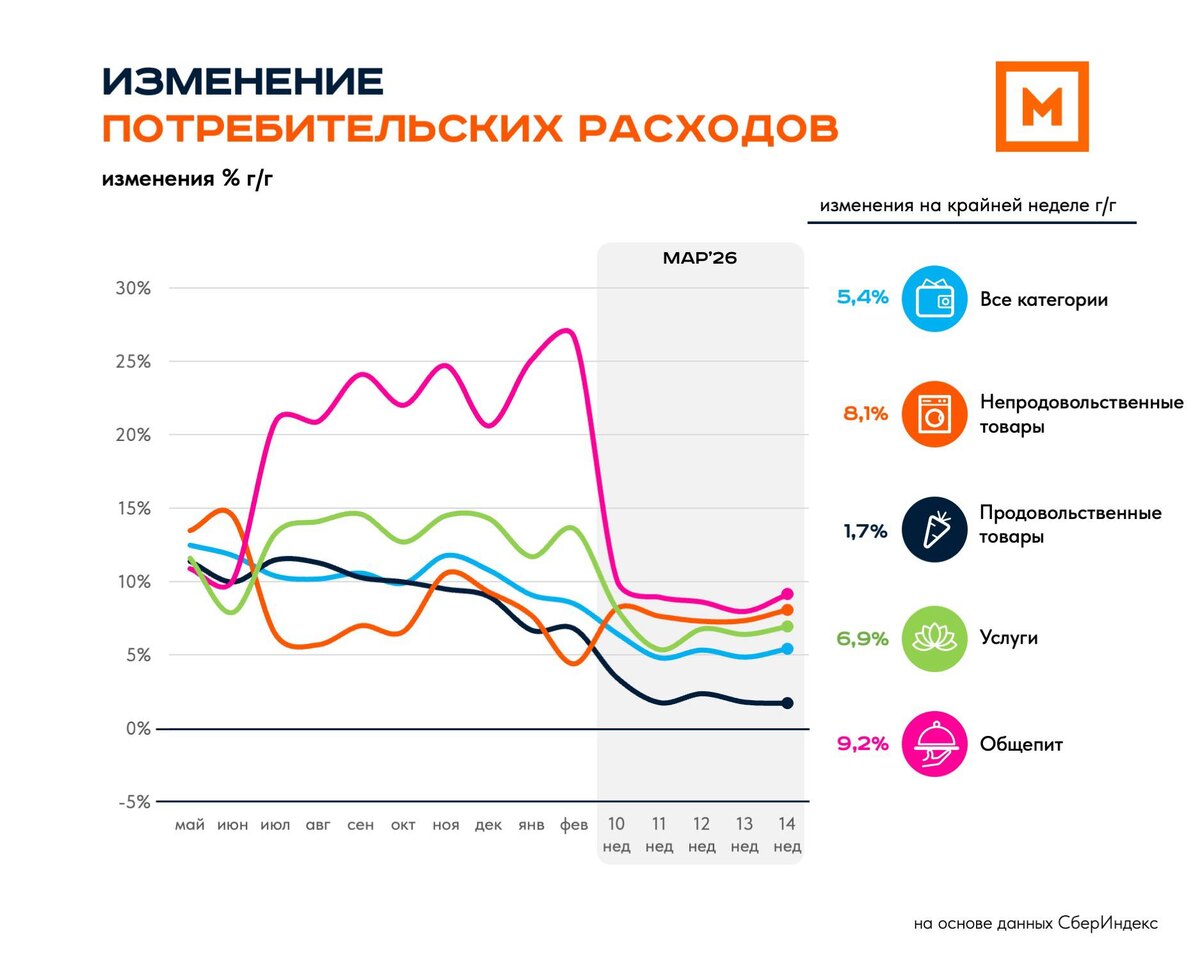 Пока все увлеченно ковыряются в отчетах за 2025 год, пытаясь понять, кто из ритейлеров был «молодцом», а кто просто удачно мимикрировал под рынок, у нас незаметно пролетел целый квартал 2026-го. Осознайте масштаб: три месяца жизни и планов — уже в корзине «выполненное» (или «профакапленное», тут уж у кого как). Смотрим на свежие цифры потребительских расходов за 14-ю неделю (самый старт Q2) и видим любопытное: кажется, рынок таки нащупал ту самую «точку ноль». Это когда падать уже либо некуда, либо лень, а расти еще не на что. Хочется верить, что это не коллективная галлюцинация аналитиков, а реальный фундамент, от которого можно оттолкнуться. 👍 MAX | Дзен | VK | Telegram | МагМаг Новости #потребители #аналитика #СберИндекс