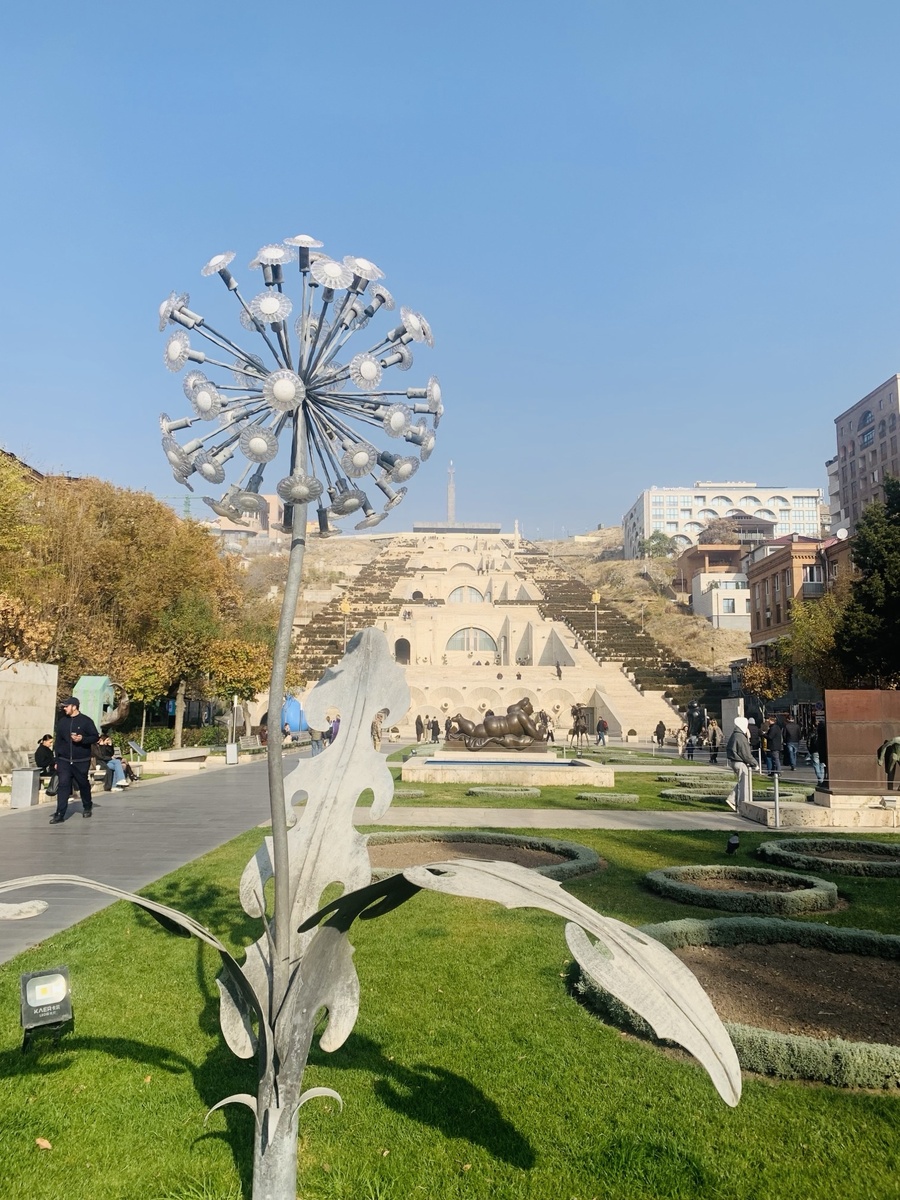 Почему же Каскад стал таким популярным? Сейчас это не просто лестница, а целое общественное пространство с шикарным видом на центр города и величественный Арарат. Здесь назначают свидания, любуются закатами, сидят на лавочках и ступенях, наслаждаясь панорамой. Здесь летом журчат фонтаны, пестрят яркими красками клумбы, а любопытные скульптуры и арт-объекты будоражат умы. Хочешь - неспешно поднимайся на вершину по лестнице, отдыхая и открывая интересности на каждом ярусе. А хочешь (572 ступени - это не для слабонервных) - езжай на эскалаторе внутри комплекса, заходя в залы обустроенного там музея.