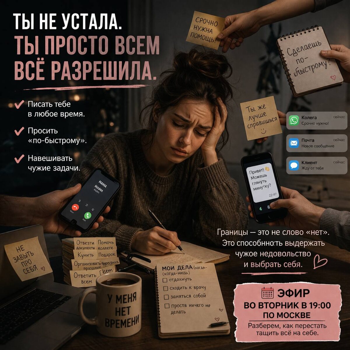 Ты просто всем всё разрешила Ты просто всем всё разрешила. Разрешила писать тебе в 22:47: «можно маленький вопросик?» Разрешила дергать тебя, когда ты только села поесть: «слушай, это срочно» Разрешила вешать на тебя чужие задачи: «у тебя же лучше получается» И ты каждый раз как будто нажимаешь одну кнопку: «ну ладно…» Как будто ты - не человек, а кнопка «всегда доступна». Ты говоришь: «у меня нет времени» Но давай честно. Твоё время утекает не рекой, а как будто кран капает. Кап. - ответила сразу Кап. - согласилась, хотя не хотела Кап. - взяла лишнее И вот уже не кран - а потоп. Ты думаешь, проблема в том, что ты не умеешь говорить «нет». Ты умеешь, но дальше происходит вот что: Ты сказала «нет» → человек напрягся → стал холоднее / обиделся / надавил И внутри поднимается: «блин… неудобно…» И ты такая: «ладно, давай сделаю» Это как поставить дверь, но оставлять её открытой, потому что кто-то постучал чуть громче. Вот так выглядят границы, которые не работают. Границы - это не пр