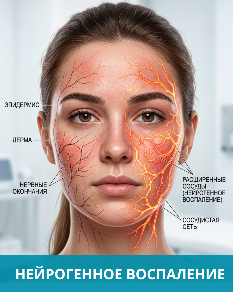 Вы замечали, что чувствительная кожа иногда неадекватно реагирует на различные раздражители? Например, понервничали — кожа покраснела от стресса? В помещении сухой воздух и активно работают батареи — кожа сохнет и краснеет? Вроде бы недолго находились на солнце, но кожа становится чувствительной и вновь краснеет? Виной не просто повышение температуры, а именно индивидуальная реакция организма на внешние раздражители. То, что у одних пациентов реакции не вызывает, у других сопровождается целым спектром эмоций: покраснением, жжением, повышенной чувствительностью кожи. Очень часто причина — нейрогенное воспаление кожи. 🧠 Что это такое? Наша кожа тесно связана с нервной системой. Когда мы испытываем стресс, усталость, недосып или сильные эмоции, нервные окончания в коже выделяют специальные вещества — нейропептиды. Они запускают цепочку реакций: — расширяются сосуды