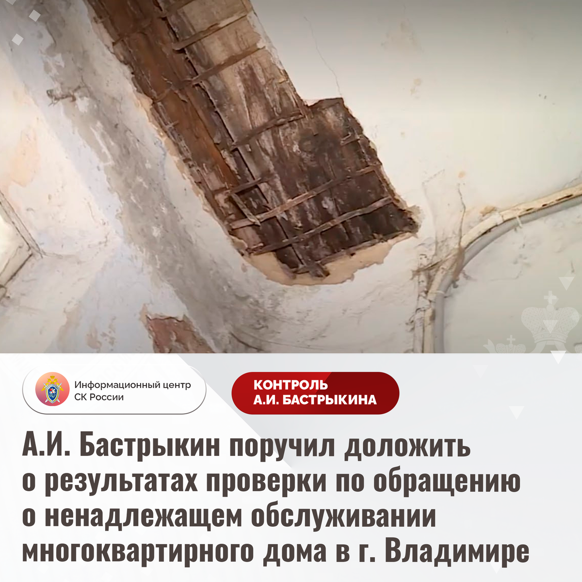 А.И. Бастрыкин поручил доложить о результатах проверки по обращению о ненадлежащем обслуживании многоквартирного дома в г. Владимире В комментариях в аккаунте приёмной Председателя СК России А.И. Бастрыкина в социальной сети «ВКонтакте» размещено обращение по вопросу ненадлежащего обслуживания многоквартирного дома на улице Элеваторной в городе Владимире. Длительное время в здании 1960 года постройки нарушена целостность кровли, ввиду чего регулярно происходят коммунальные аварии. В феврале текущего года из-за скопления влаги произошло частичное обрушение межэтажных перекрытий на лестничной площадке. Несмотря на имеющиеся проблемы, ремонтные работы не проводятся. Обращения в различные инстанции результатов не принесли. Указанная ситуация освещалась в СМИ. В СУ СК России по Владимирской области организована процессуальная проверка. Председатель Следственного комитета Российской Федерации Александр Иванович Бастрыкин поручил руководителю СУ СК России по Владимирской области Артему Алекс