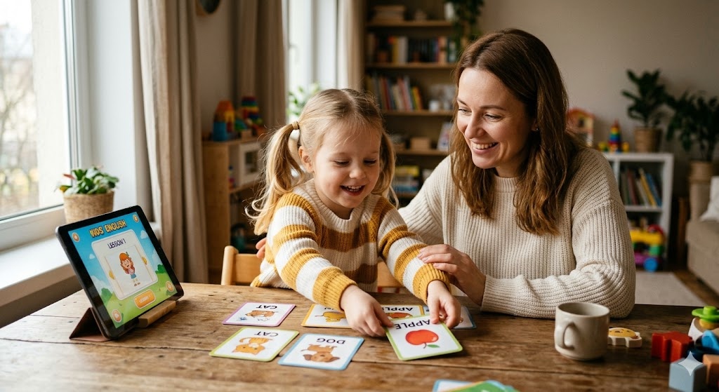 Хороший знак — когда ребёнок после занятия пользуется новыми словами или фразами в обычной жизни: называет предметы по-английски, поёт песенку, показывает маме что узнал. Это значит, что язык прижился — перешёл из «урока» в живой опыт.