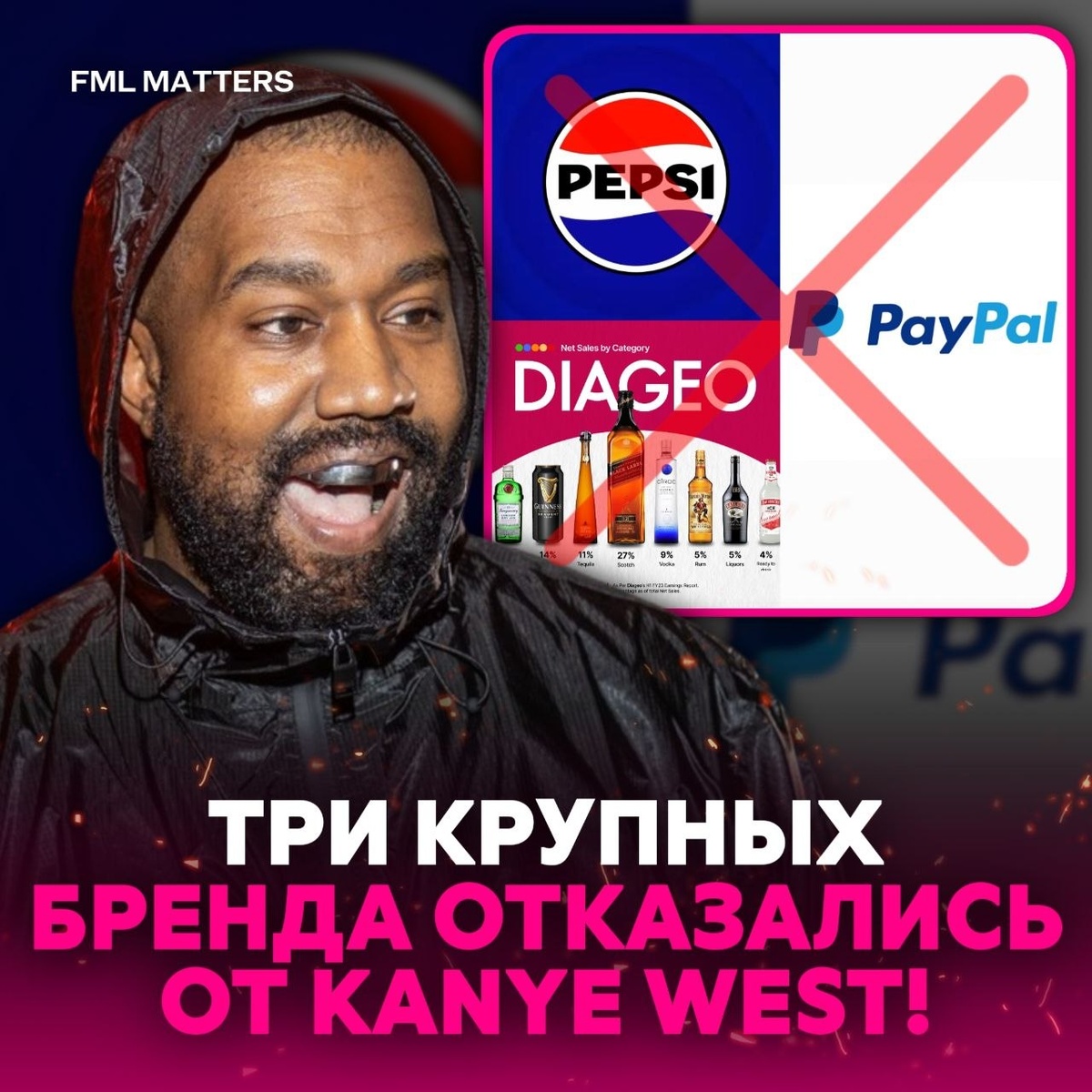 ! Сразу три крупные компании — PayPal, Pepsi и Diageo — отказались от брендирования Wireless Festival на фоне участия Йе в качестве хедлайнера. По данным ITV News, причиной стали его ранее сделанные скандальные высказывания. 💀 FML MATTERS