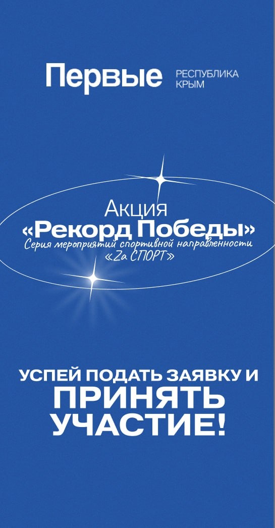! Дорогие жители и гости Республики Крым! Уже совсем скоро стартует акция «Рекорд Победы» в рамках Серии мероприятий спортивной направленности «Zа СПОРТ». ⏳ Приём заявок завершается ЗАВТРА - 7 апреля (включительно)! Это последний шанс стать частью масштабного события, объединяющего весь полуостров! Мы приглашаем детей, молодёжь, родителей, наставников и всех жителей присоединиться к акции и внести свой вклад в общее дело памяти, силы и единства. Подавайте заявку прямо сейчас и присоединяйтесь! Ссылка на регистрацию: ПОДАТЬ ЗАЯВКУ Не упустите свой шанс стать частью общего рекорда! #ДвижениеПервых #ДвижениеПервыхКрым #ЗаСпортКрым #РекордПобедыКрым