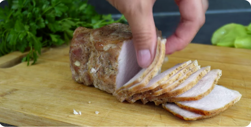 Нарезка. Охлаждённое мясо режьте острым длинным ножом, одним движением, без «пилки». Толщина ломтика — 2–3 мм, как у хорошей варёной колбасы.