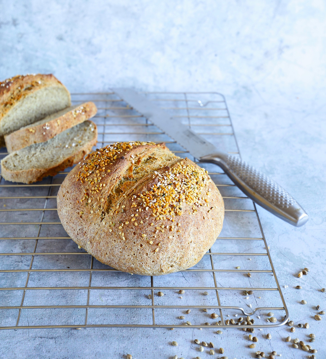 Давно хотелось мне «довести до ума» рецепт хлеба с конопляной мукой. Именно в хлебе внешне ничем не примечательная, довольно грубая конопляная мука раскрывается: аромат каленого орешка разливается по дому, а хрустящая и румяная корочка так и просит отрезать свежую горбушку.