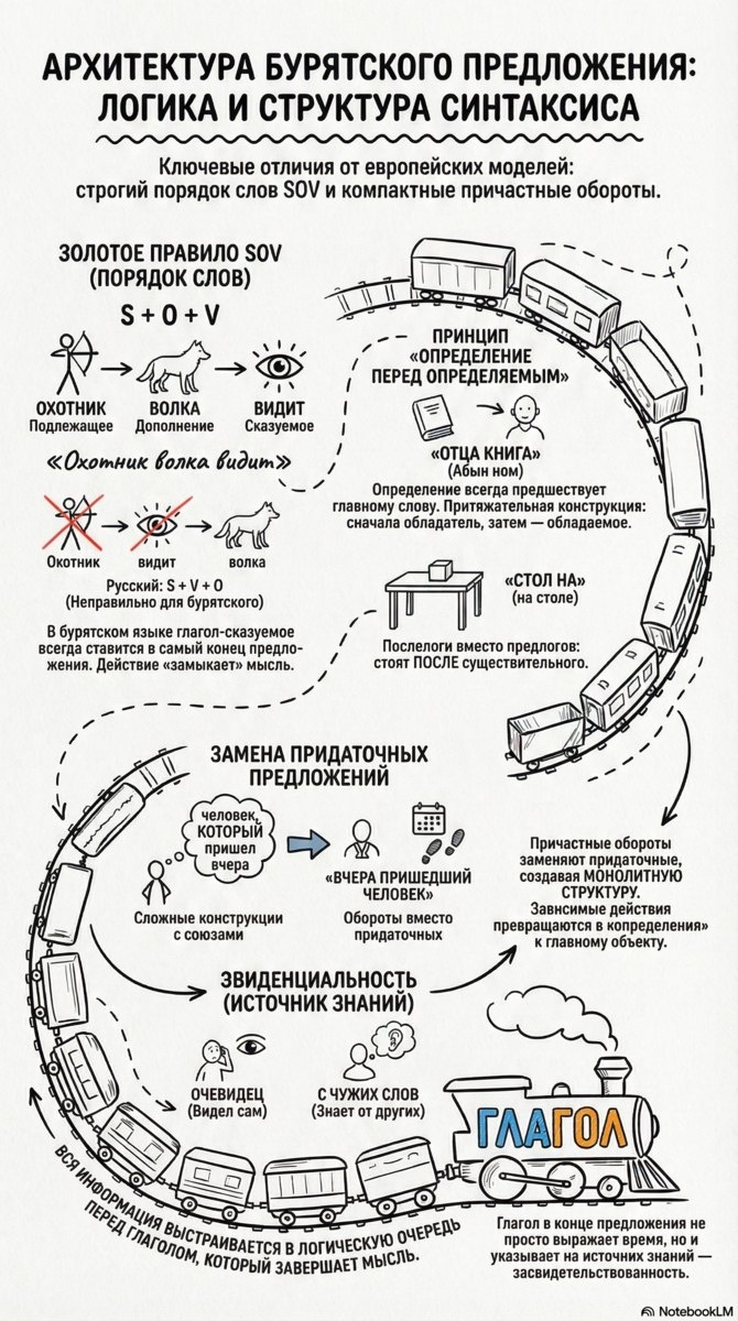 Архитектура бурятского предложения строится на строгом порядке слов SOV: подлежащее, дополнение и в конце сказуемое. Глагол всегда ставится в самый конец, замыкая мысль. Другой важный принцип гласит, что определение всегда предшествует определяемому слову. Например, принадлежность выражается конструкцией сначала обладатель, затем обладаемое: Абын ном (Книга отца). Вместо предлогов используются послелоги, которые стоят после существительного. Сложные придаточные предложения заменяются компактными причастными оборотами, что создает монолитную структуру предложения. Уникальной чертой является эвиденциальность: форма глагола указывает на источник знаний, разделяя свидетельство очевидца и информацию, полученную с чужих слов. Вся информация выстраивается в логическую очередь перед глаголом, который завершает высказывание.