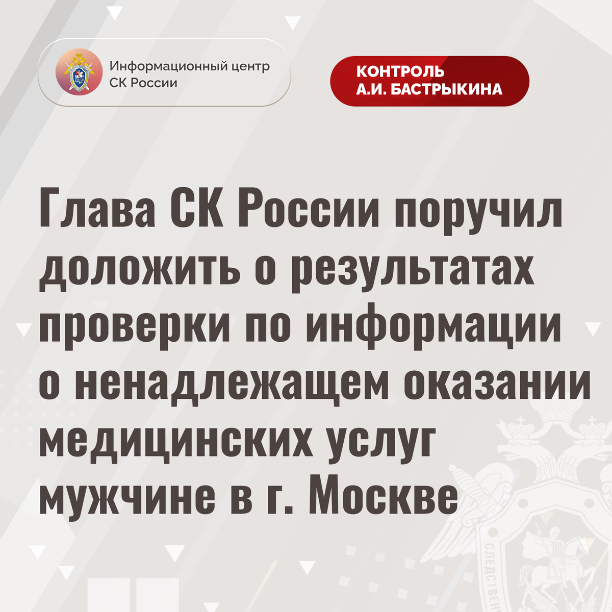 Глава СК России поручил доложить о результатах проверки по информации о ненадлежащем оказании медицинских услуг мужчине в г. Москве