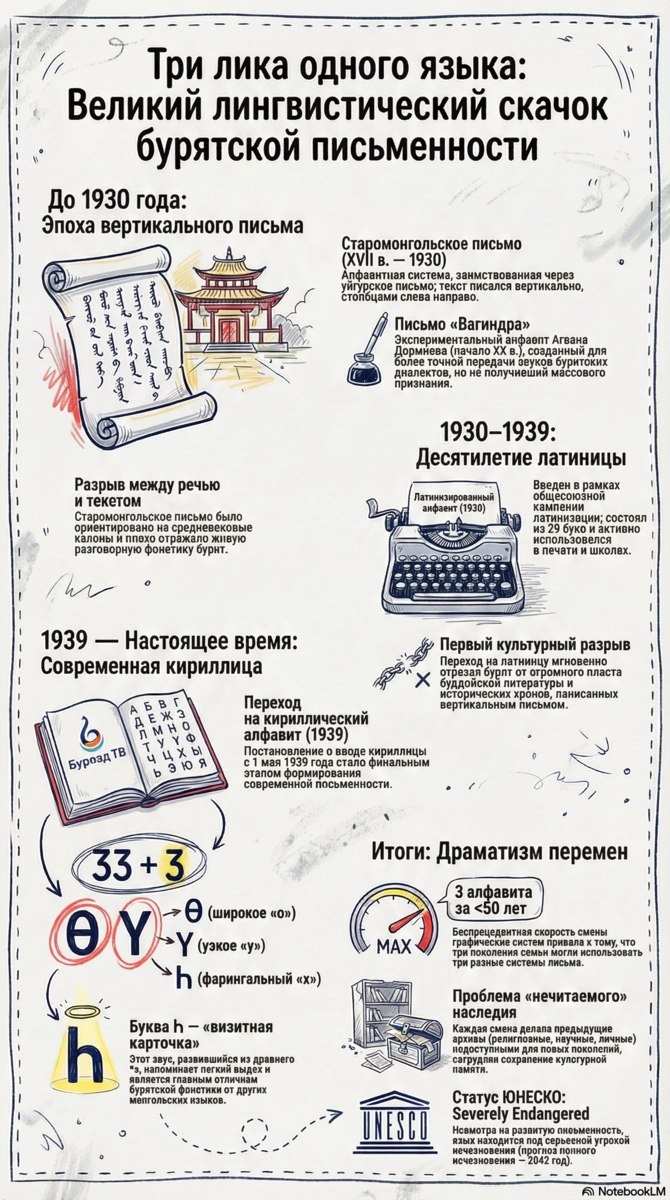 История бурятской письменности отмечена серией драматических перемен. До 1930 года использовалось вертикальное старомонгольское письмо, ориентированное на средневековые каноны. В начале двадцатого века существовал экспериментальный алфавит Вагиндра, призванный точнее передавать звуки диалектов, но он не получил массового признания. В период с 1930 по 1939 годы в рамках общесоюзной кампании был введен латинизированный алфавит из 29 букв. С 1939 года и по настоящее время используется кириллица, включающая 33 русские буквы и 3 специфические: Ө, Ү и фарингальную Һ. Последняя буква стала визитной карточкой фонетики, заменив древний звук s. Смена трех алфавитов менее чем за 50 лет привела к культурному разрыву и проблеме нечитаемого наследия архивов. ЮНЕСКО присвоило бурятскому языку статус Severely Endangered с прогнозом полного исчезновения к 2042 году.