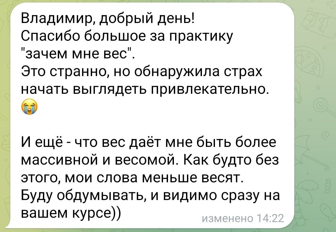 А по поводу весомости - была история ещё в книге: мальчик в неравной борьбе проиграл более крупному двоюродному брату пульт от телевизора. И подсознательно решил что нужно быть большим. Ситуация забылась. Прошло 30 лет, он ростом 2 метра и с лишними 50-60 кг. Но если попросить его представить себя в желаемом весе (например 110) - то внутри можно найти ощущение "я недостаточно защищён". В том числе такие "ошибки в прошивке" мы будем находить и убирать на курсе. Завтра повышение цен. Чтобы записаться - напишите кодовую фразу «Я худею» - вот сюда: t.me/+79853851188 Посмотреть 100+ отзывов: https://t.me/dernovclients Не потеряться: МАХ - https://max.ru/join/yS8yW45oWpkUhczVaGo_BYEnuVhAfXBuwX8d-kYE0Yw ВК - https://vk.ru/brain_firmware #гипноз #психосоматика #аллергия #аит #алопеция #дерматит #гипнотерапия #лишнийвес #рпп #похудение #пп #яхудею
