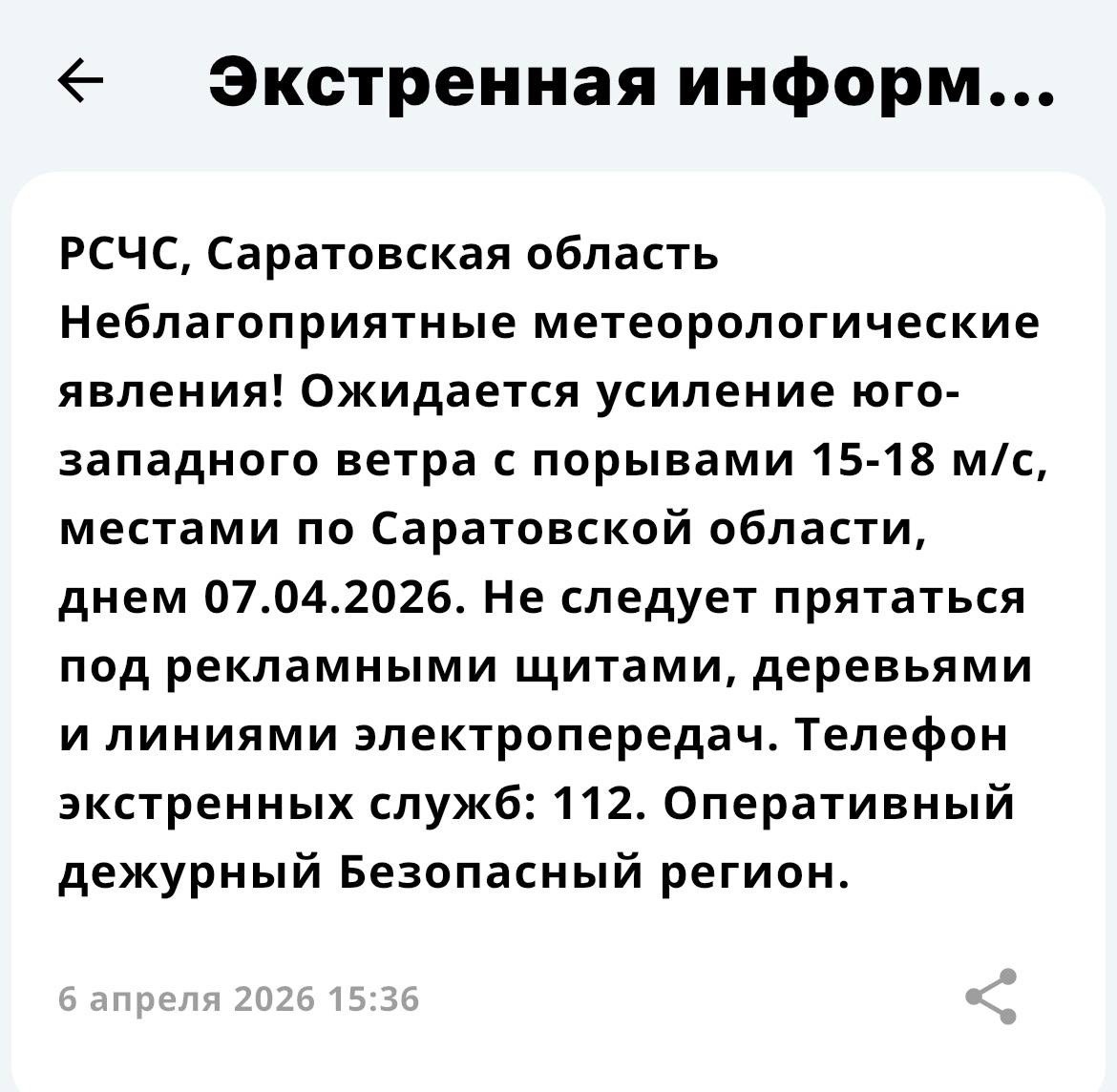 "Экстренная информация РСЧС*: Ожидаются неблагоприятные метеорологические явления (усиление юго-западного ветра с порывами 15-18 м/с), местами по Саратовской области, днем 07.04.2026", — сказано в уведомлении.