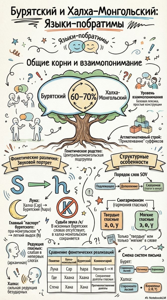 Бурятский и халха-монгольский языки являются ближайшими генетическими родственниками, разделяя от 60% до 70% общей лексики и грамматических структур. Оба языка относятся к центральномонгольской подгруппе и имеют агглютинативный строй со строгим порядком слов SOV. Ключевое отличие заключается в фонетическом портрете: бурятский язык заменил пра-монгольский звук s на фарингальный h (например, hара вместо сар) и утратил смычный к в исконных словах. Также бурятский сохраняет архаичную слабую редукцию гласных в непервых слогах, в то время как в халха-монгольском наблюдается сильное сокращение безударных звуков. История письменности бурятского языка более драматична: за полвека он трижды менял алфавит, пройдя через старомонгольское письмо и латиницу к современной кириллице.