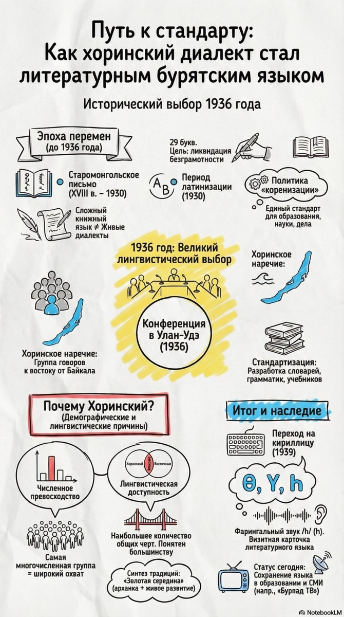 Становление современного литературного бурятского языка произошло в 1936 году на лингвистической конференции в Улан-Удэ. Основой стандарта стало хоринское наречие — группа говоров восточного Прибайкалья. Выбор был обусловлен как демографическим превосходством носителей, так и лингвистической доступностью: хоринский диалект содержит наибольшее количество черт, общих для большинства других говоров, становясь мостом между всеми бурятскими группами. До этого периода язык прошел через эпоху вертикального старомонгольского письма и период латинизации. Итогом реформ стало введение кириллицы в 1939 году со специфическими буквами Ө, Ү и Һ. Сегодня этот стандарт является базой для образования и СМИ, включая вещание телеканала Буряад ТВ.