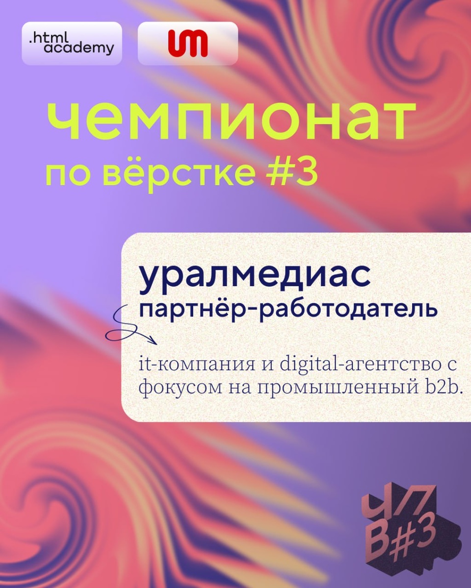 Третий сезон чемпионата по вёрстке идёт уже неделю — участники верстают макет от Mish и прорабатывают детали. Продолжаем знакомить с партнёрами-работодателями. Уралмедиас — аккредитованная IT-компания и digital-агентство с фокусом на промышленный B2B. Входит в ТОП-100 агентств России по версии Рейтинга Рунета. «Красная Рамка» — digital-студия, которая делает сайты, сервисы и мобильные приложения. Специализируется на нестандартных проектах: высоконагруженные платформы, стартапы, геймифицированные интерфейсы. SOK — разрабатывает интернет-магазины, B2B-платформы и корпоративные порталы. Все партнёры смотрят на результаты участников чемпионата. 👍 Профессиональный трек Резервный канал в MAX
