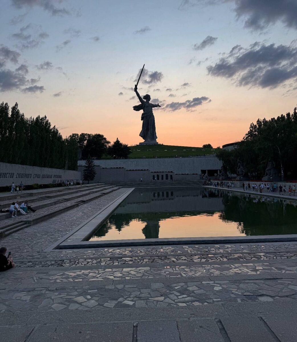 Я ехала в Волгоград с одной мыслью: увидеть «Родину-мать» и уехать. Вернулась через три дня с ощущением, что не успела половины. Волгоград обманывает ожиданиями. Думаешь, что едешь к мемориалу. А попадаешь в живой, растянутый вдоль Волги на сто километров город с несколькими слоями истории, хорошей едой и своим ритмом, не похожим ни на южный курорт, ни на среднерусский областной центр. Мамаев курган виден с воздуха ещё до посадки. Силуэт «Родины-матери» задаёт тон всему городу. 85 метров вместе с мечом, 52 метра сама фигура. Цифры ничего не говорят, пока не стоишь у подножия. Подниматься надо снизу, как задумано. Весь смысл, в постепенном открытии: сначала стены-руины с записями военных сводок и голосом Левитана из динамиков, потом площадь Героев, потом Зал Воинской Славы с Вечным огнём, и только потом, она, уже на вершине. Уходит не меньше часа если идти размеренно и все изучать. Летом берите воду: склон открытый, солнце жгучее. Я пришла туда дважды, днём и вечером. Вечером лучше. Под
