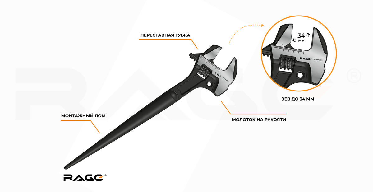 Кто работает руками, знает: на объекте важен каждый инструмент, но ещё важнее — не таскать с собой лишнего. Каждый выезд — это мини‑экзамен на организованность. Собрал ящик — потратил время, забыл нужный размер — потерял час, тащишь лишний вес — устал к обеду. Но есть вещи, которые можно и нужно совмещать. И одна из них — разводной ключ с переставной губкой 4в1 RAGE Furious. Инструмент, который перекрывает три самые частые задачи, с которыми вы сталкиваетесь на выезде. Проверьте сами. Стандартный разводной ключ умеет только одно: крутить гайки и болты, да и то с оговорками — прикипевший крепёж часто срывает грани. А если нужно поджать трубу, подстучать или что‑то поддеть — приходится лезть в ящик за другим инструментом. Ключ 4в1 RAGE Furious сделан иначе. Он сочетает в себе: И всё это в одном корпусе длиной 405 мм, который легко помещается в сумку или крепится на пояс. Работать в тумбе руками неудобно, а короткий ключ если и подлезает, то рычага часто не хватает. Если же соединение гл