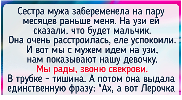 Сестра мужа забеременела на пару месяцев раньше меня. На узи ей сказали, что будет мальчик. Она очень расстроилась, еле успокоили. И вот мы с мужем идем на узи, нам показывают нашу девочку. Мы рады, звоню свекрови. В трубке — тишина. А потом она выдала единственную фразу: «Ах, а вот Лерочка расстроится, она же девочку хотела».