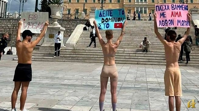 Веган-активисты провели символическую акцию протеста в центре Афин, выступив против массового забоя ягнят и козлят в преддверии Пасхи. Для РФ зеркало https://russianathens.ru