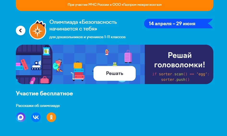 Олимпиада Учи.ру и МЧС России «Безопасность начинается с тебя» для дошкольников и учеников 1–11 классов пройдет в России с 14.04.2026 по 29.06.2026. Олимпиада организована при участии МЧС России. Содержит задания, посвященные безопасности. Помогает узнать, как вести себя в опасной ситуации дома, в лесу, на водоёме. Не требует дополнительной подготовки. Подробности здесь.