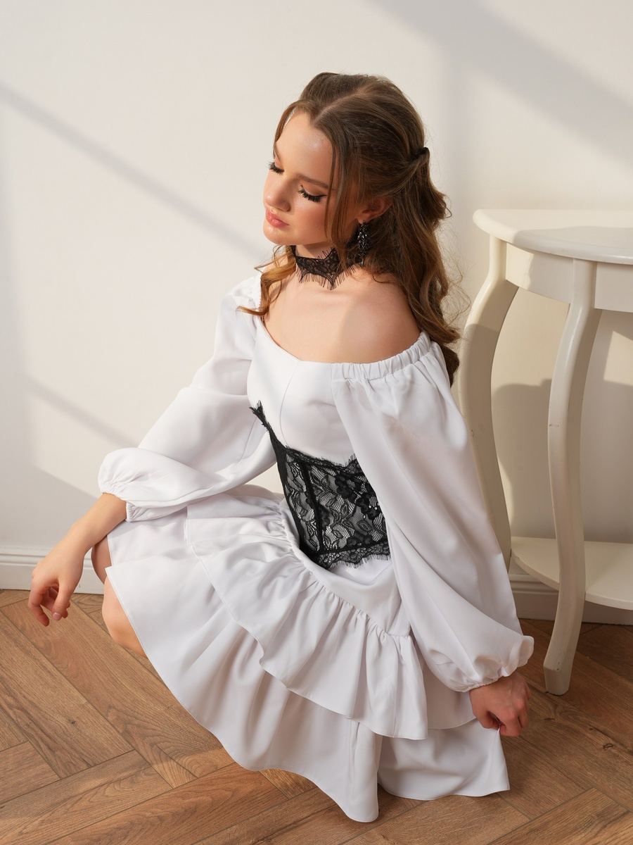 - Если хочется образ с характером — платье с чёрным кружевным корсетом.