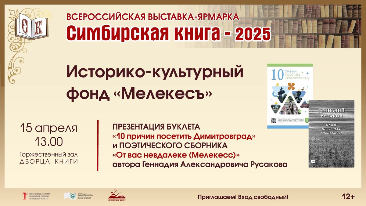 📆15 апреля в 13.00 в Торжественном зале Дворца книги (г. Ульяновск, пер. Карамзина, 3/2) в рамках Всероссийской выставки-ярмарки и XXIII Областной выставки–конкурса издательской продукции «Симбирская книга – 2025» состоится презентация книг, изданных историко-культурным фондом «Мелекесъ». Краевед, председатель Фонда Андрей Мокеев представит поэтический сборник Геннадия Русакова «От вас невдалеке (Мелекесс)» и путеводитель «10 причин посетить Димитровград». 👉Подробнее: https://clck.ru/3SxQAw ❗С 1 по 22 апреля на сайте Дворца книги идёт онлайн-голосование, по результатам которого будет определён победитель в номинации «Выбор читателя»! Обратите внимание, что в форме для голосования индивидуальные заявки выделены в отдельную большую группу «Индивидуальные авторы»! ✅Голосование доступно по ссылке: https://clck.ru/3SshK5