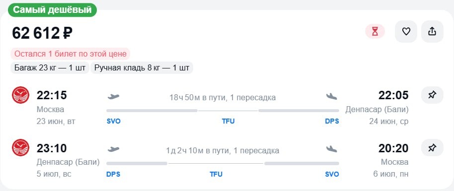 🇮🇩Билеты из Москвы на Бали за 62600 рублей в обе стороны, с пересадкой в Чэнду
