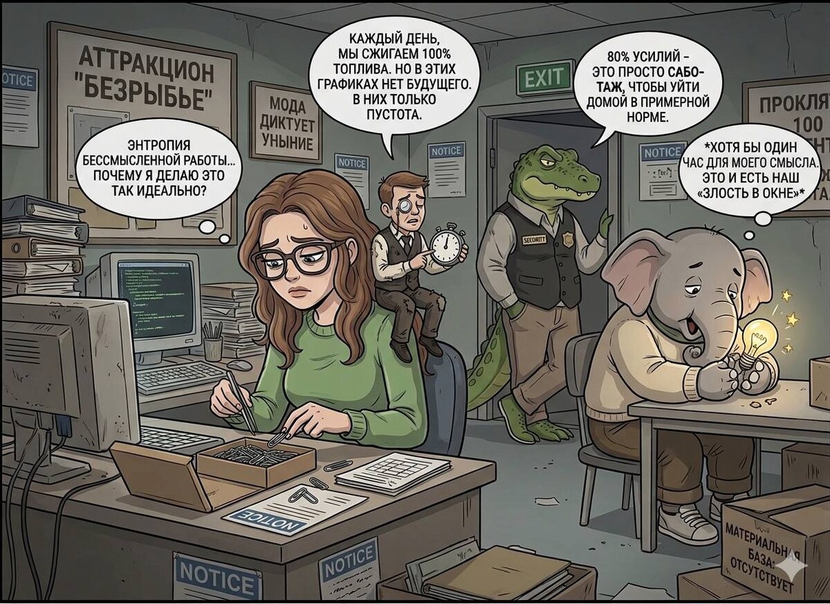 Когда твоё будущее рисуется исключительно черными красками, а настоящая работа — это бесперспективное «безрыбье», советы «радоваться мелочам» звучат как издевка. Сложно праздновать чашку кофе, когда у тебя нет материальной базы, а интеллект услужливо подсовывает графики неизбежного падения. В этой ситуации мы попадаем в ловушку добросовестности. Многие из нас приучены выполнять любую работу идеально. Даже если она малооплачиваема, скучна и ведет в никуда. Мы вкладываем 100% когнитивного ресурса в покраску палубы тонущего корабля. И это ловушка. Интеллект понимает, что это бессмысленно, но внутренняя прошивка не позволяет делать плохо. В результате мы сжигаем топливо, которое жизненно нам необходимо для поиска реального выхода. В таких условиях маленькая победа — это не успех в делах. Это отвоеванный у энтропии ресурс. Победой будет решение сделать бессмысленную работу на 80%. Не из лени, а из хирургической точности: сохранить 20% энергии для себя, для своего «чердака», где вы всё еще ж