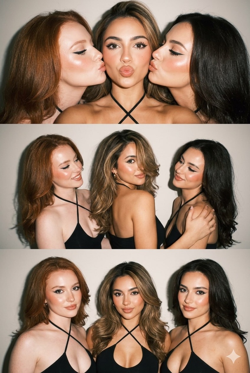 Давно не было промптов для подруг Создай фото. **// Общие параметры //** Вертикальный коллаж из трёх кадров в эстетике Y2K. Три девушки с фото — строго сохранить черты лица, форму лица, пропорции и индивидуальные особенности внешности каждой с загруженных референсов. Нейтральный светлый фон. Жёсткое прямое освещение сверху — резкие тени на стене позади, эффект пересвета. Съёмка на iPhone 17 Pro Max со вспышкой. Винтажная цифровая текстура, лёгкая размытость, гламурная атмосфера. Без подписей, эмблем, брендов и дат. **// Образ //** Объёмные распущенные укладки, выполненные брашингом. Макияж в духе Y2K: графичные чёрные стрелки, вытянутые к вискам — эффект кошачьего взгляда; густо накрашенные разделённые ресницы; сияющая кожа с хайлайтером на скулах, лбу и переносице; персиково-розовые румяна; нюдовый блеск на губах с влажным эффектом. Одежда: чёрные топы с тонкими бретелями, перекрещивающимися на шее и груди. **// Кадр 1 — Крупный план //** Девушки очень близко к камере. Центральная