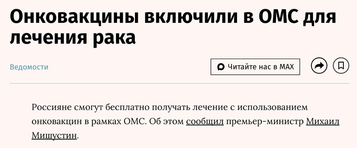 Вы вообще можете представить себе, что новость о том, что вакцина от рака будет включена в ОМС, звучит как рядовая дежурная заметка
