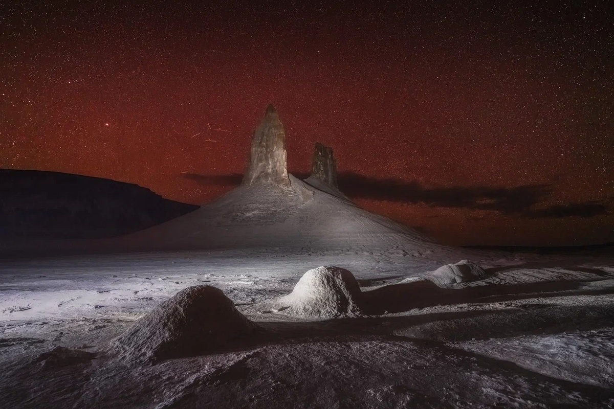 Сегодня по этому дну ходят пешком, а под ногами до сих пор попадаются окаменевшие ракушки и зубы древних акул. Место, которое называют «Марсом на Земле», ждёт нас с 17 по 26 апреля 2026 года. Апрель идеальное окно для поездки. Днём +20…+30°C, цветущая степь, нет изнуряющей жары, а ночью небо становится таким чистым, что Млечный Путь виден невооружённым глазом. Мы специально выбрали даты рядом с новолунием: звёздные панорамы получатся даже на «средней» оптике. Но главные герои здесь скалы. На въезде в урочище нас встретят «Клыки», два 200-метровых известняковых пика, похожие на окаменевших драконов. Ветер и вода миллионы лет вытачивали из осадочных пород целую галерею скульптур. У местных есть имена для каждой: «Юрта», «Подводная лодка», «Гребень дракона», «Аврора». Вы добавите к этому списку свои названия и свои ракурсы — таких, как у вас, не будет больше ни у кого. В полдень долина серая (так переводится «Босжира» с казахского «серая долина» или «блеклая земля»). Но на закате ск