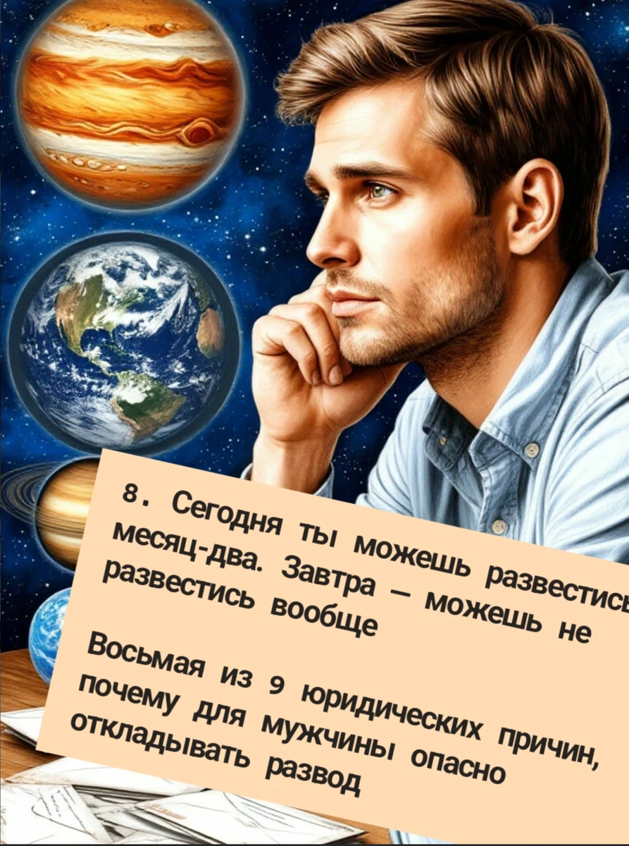 Восьмая из 9 юридических причин, почему для мужчины опасно откладывать развод (осторожно, это Восьмая из 9 юридических возможностей для женщин, которые хотят отомстить бывшему) Сегодня ты можешь развестись за месяц. Завтра — можешь не развестись вообще. Пока жена на связи — у тебя есть контроль над ситуацией. Даже если нет денег на юриста, развод — это решаемый вопрос: Госпошлина 5000 руб. Через ЗАГС совсем просто, но не всем можно. Через суд - нужно время и терпение, или можно пригласить юриста. Неприятно, но реально и предсказуемо. Важно помнить, что это “окно возможностей” не бесконечно. Потому что в любой момент она может: И в этот момент всё меняется. Развод из процедуры превращается в проблему без сроков и гарантий. Суд обязан уведомить второго супруга. А если это невозможно — процесс зависает. Уведомление становится ОЧЕНЬ дорогим. Иногда невозможным. На месяцы. Иногда — на годы. Для некоторых навсегда. Есть случаи, когда люди до сих пор формально состоят в браке только потому,