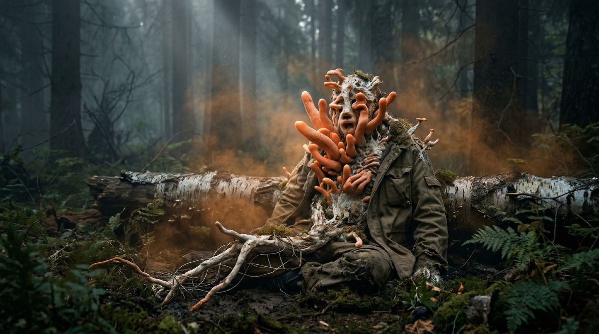 Никакой крови или следов разложения не было. Природа просто поглотила их. Белый «мох» оказался плотной сеткой мицелия — грибницы, которая намертво спеленала органику, превратив тела в идеальные герметичные инкубаторы. Яркие оранжевые грибы росли прямо из тех мест, где питательных веществ было больше всего. У человекаподобного силуэта они плотным пучком вырывались из того места, где раньше было лицо.